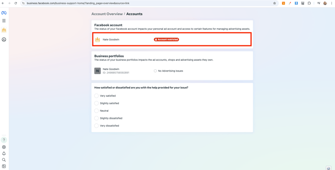 The Account Overview section will display any restrictions and outline which assets (such as Instagram linking) are affected.
