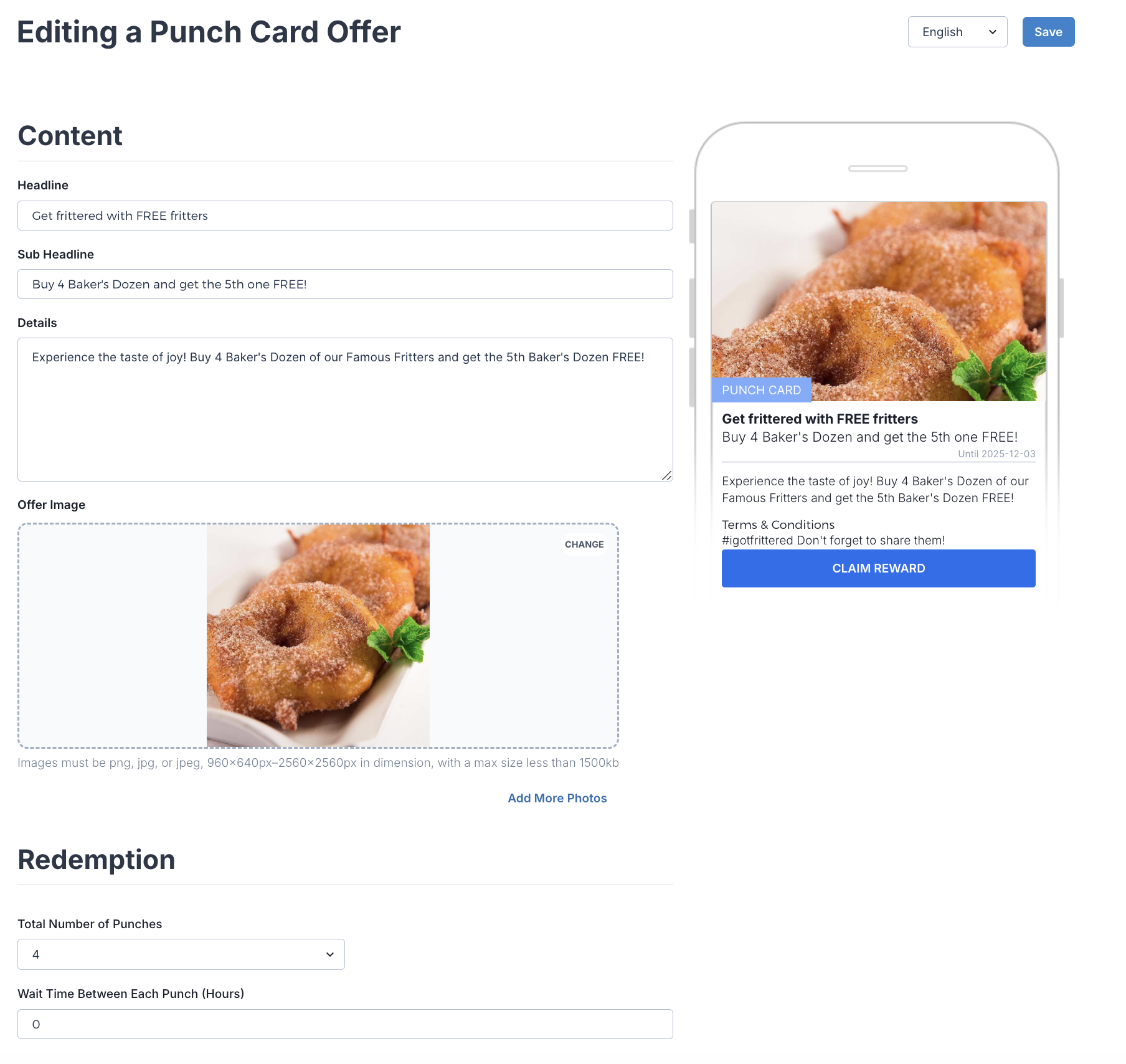 In the below example, consumers only need to purchase 4 fritters to get a 5th for free. Fritters are one of the most popular items on the menu. Wait Time Between Each Punch can be set if a business wants a consumer to wait for example 24 hours between being able to come back in for another punch.