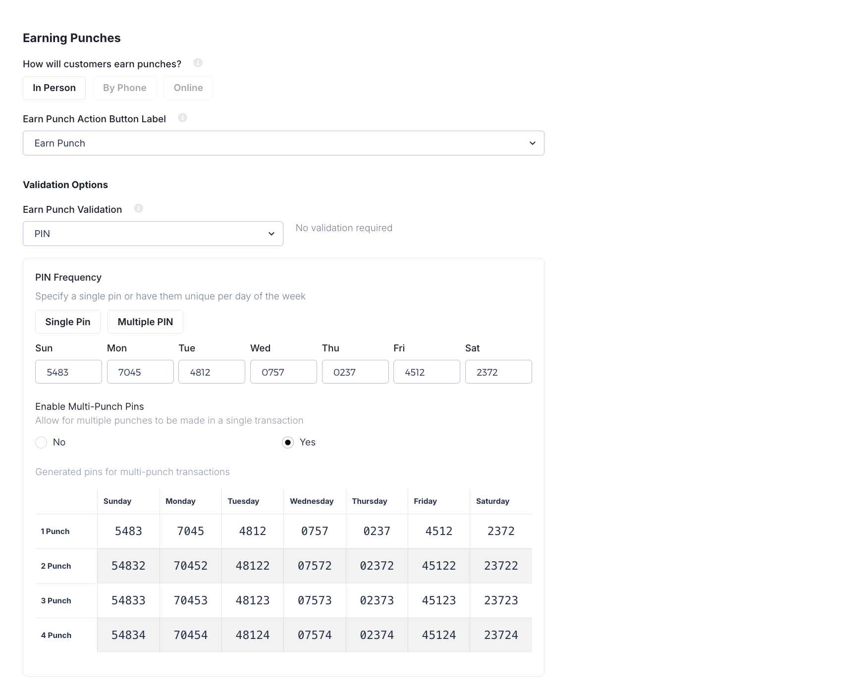 In the below example, the business chose "Earn Punch" as the call to action with a verification method of PIN that rotates based on the day of the week. They have also enabled the ability for a consumer to earn multiple punches in a single transaction.