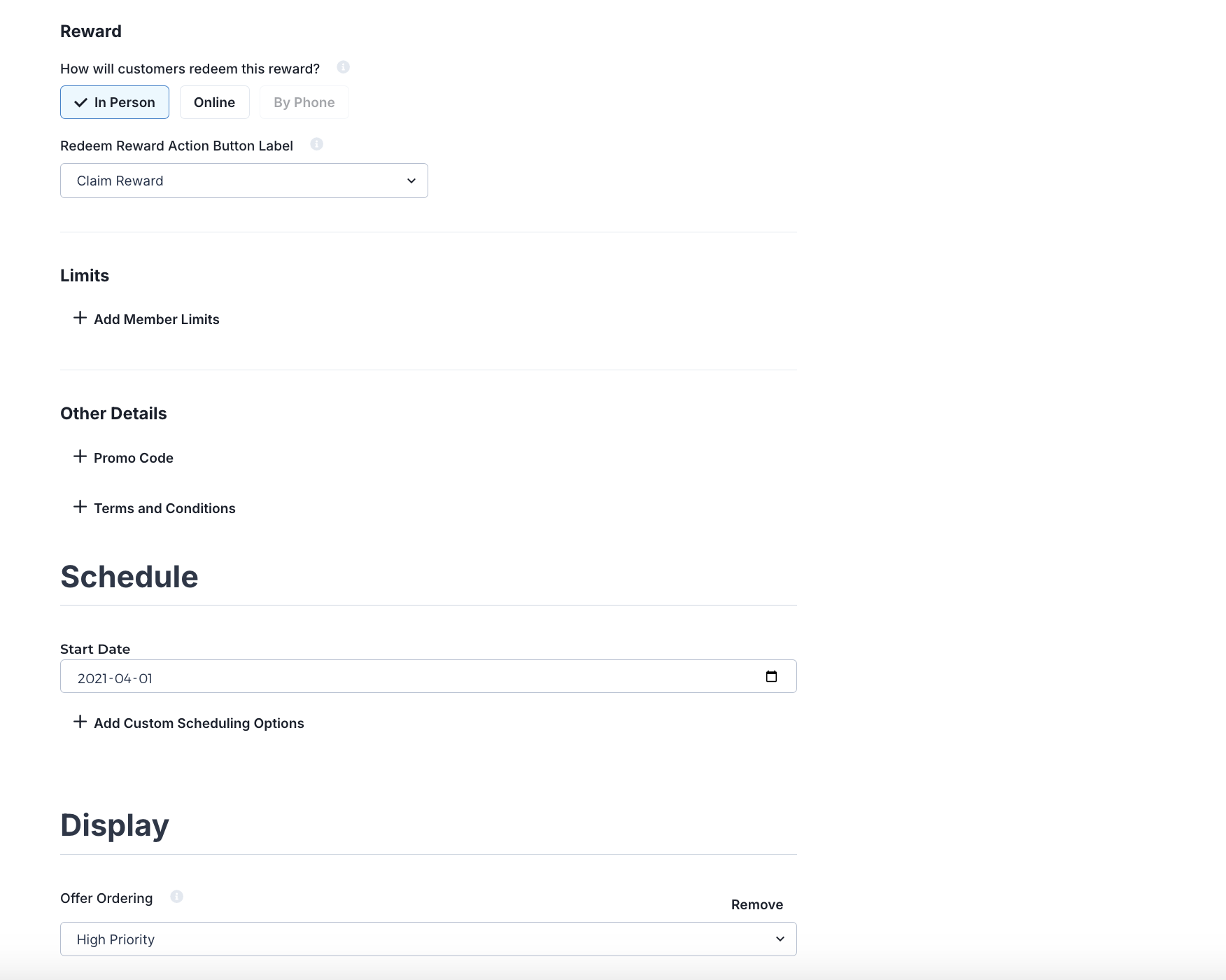 Businesses can also set the reward call to action, limits on the number of times a consumer can get the reward as well as schedule for specific times.